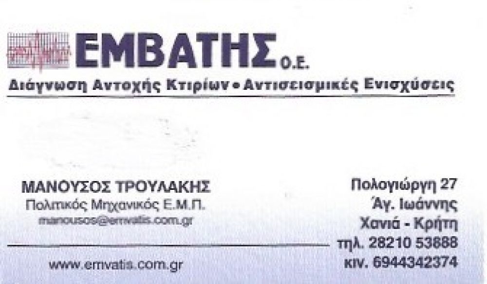 ΤΕΧΝΙΚΟ ΓΡΑΦΕΙΟ ΣΤΑ ΧΑΝΙΑ ,ΤΕΧΝΙΚΗ ΕΤΑΙΡΙΑ ΣΤΑ ΧΑΝΙΑ , ΕΝΙΣΧΥΣΗ ΚΤΙΡΙΩΝ , ΜΕΛΕΤΗ ΣΤΑ ΧΑΝΙΑ , ΔΙΑΧΕΙΡΙΣΗ ΕΡΓΩΝ ΣΤΑ ΧΑΝΙΑ , ΟΙΚΟΔΟΜΙΚΕΣ ΑΔΕΙΕΣ ΣΤΑ ΧΑΝΙΑ , ΠΟΛΙΤΙΚΟΣ ΜΗΧΑΝΙΚΟΣ ΣΤΑ ΧΑΝΙΑ, ΣΤΑΤΙΚΗ ΕΠΑΡΚΕΙΑ, ΕΝΙΣΧΥΣΕΙΣ