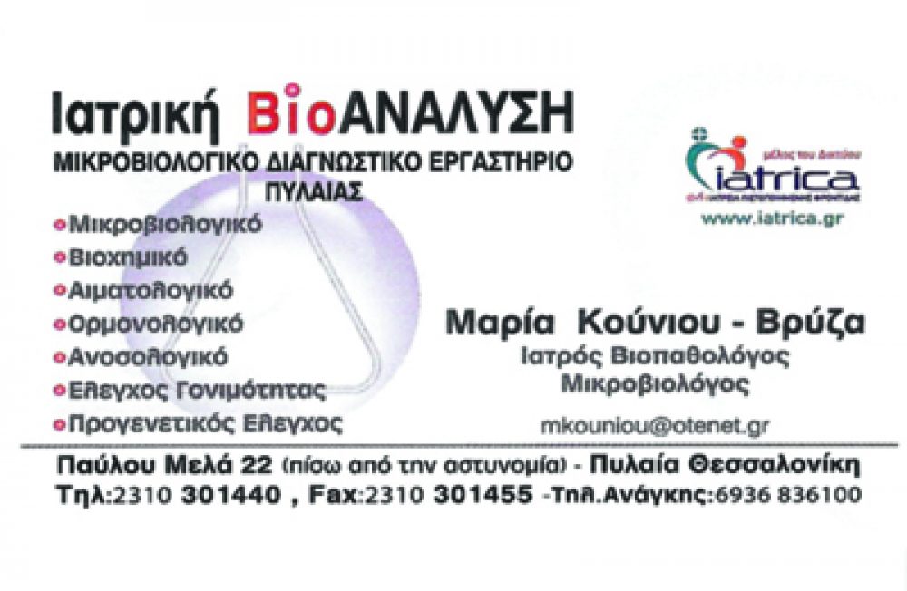 Μικροβιολογικο εργαστηριο Κουνιου Βρυζα Μαρια Πυλαία Θεσσαλονίκης , Μικροβιολογικο εργαστηριο Κουνιου Βρυζα Μαρια στήν Πυλαία Θεσσαλονίκης , Ιατρική Βιοανάλυση Πυλαία Θεσσαλονίκης , Ανοσολογικές Εξετάσεις Πυλαία Θεσσαλονίκης , Μικροβιολογικές εξετάσεις Πυλαία Θεσσαλονίκης , Ουρολογικές Εξετάσεις Πυλαία Θεσσαλονίκη , Αιματολογικές Εξετάσεις Πυλαία Θεσσαλονίκης , Βιοχημικές εξετάσεις Πυλαία Θεσσαλονίκης , Ορμονολογικές Εξετάσεις Πυλαία Θεσσαλονίκη ,Μικροβιολογικά Εργαστήρια Πυλαία Θεσσαλονίκη , Μικροβιολόγοι Πυλαία Θεσσαλονίκη , Βιοπαθολόγοι Πυλαία Θεσσαλονίκη, Αιμοληψίες κατ΄ Οίκον Πυλαία Θεσσαλονίκης , Βιοχημικό Πυλαία Θεσσαλονίκης , Ανοσολογικό Πυλαία Θεσσαλονίκης , Έλεγχος Γονιμότητας Πυλαία Θεσσαλονίκης , Προγεννητικός έλεγχος, Πυλαία Θεσσαλονίκης