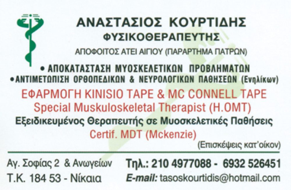 ΦΥΣΙΚΟΘΕΡΑΠΕΥΤΗΣ ΝΙΚΑΙΑ,ΦΥΣΙΚΟΘΕΡΑΠΕΙΑ ΝΙΚΑΙΑ,ΦΥΣΙΟΠΕΡΑΠΕΙΑ ΝΙΚΑΙΑ,ΑΠΟΚΑΤΑΣΤΑΣΗ ΜΥΟΣΚΕΛΕΤΙΚΩΝ ΠΡΟΒΛΗΜΑΤΩΝ ΝΙΚΑΙΑ,ΑΝΤΙΜΕΤΩΠΙΣΗ ΟΡΘΟΠΕΔΙΚΩΝ ΚΑΙ ΝΕΥΡΟΛΟΓΙΚΩΝ ΠΑΘΗΣΕΩΝ ΝΙΚΑΙΑ,ΕΦΑΡΜΟΓΗ KINISIO TAPE & MC CONNELL TAPE ΝΙΚΑΙΑ,