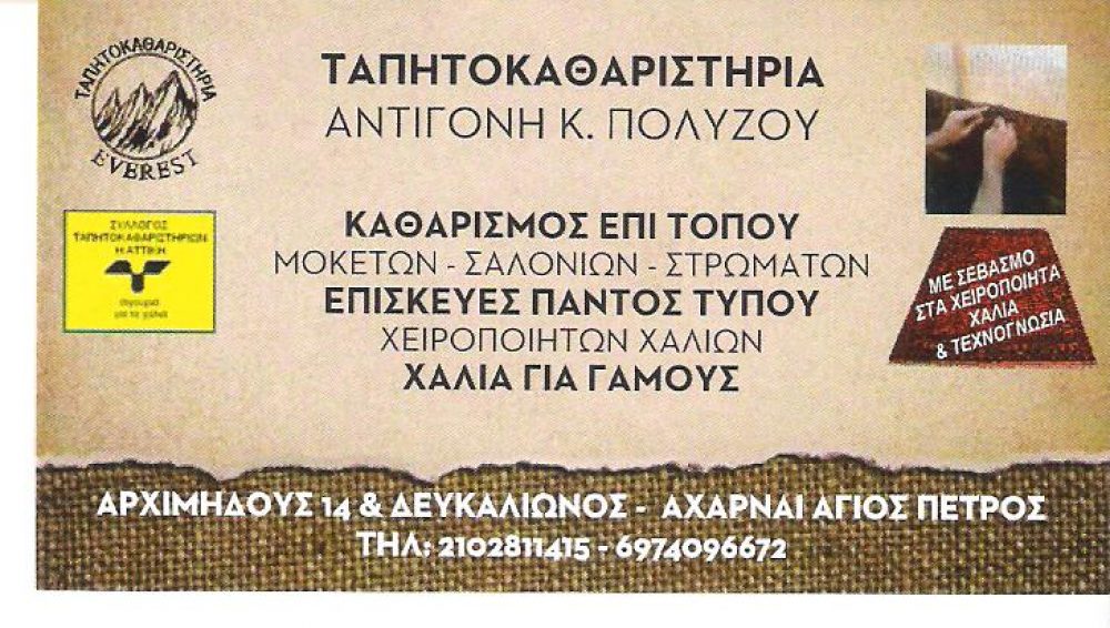 ΤΑΠΗΤΟΚΑΘΑΡΙΣΤΗΡΙΟ ΑΧΑΡΝΕΣ, ΚΑΘΑΡΙΣΜΟΣ ΧΑΛΙΩΝ ΑΧΑΡΝΕΣ, ΚΑΘΑΡΙΣΜΟΣ ΜΟΚΕΤΩΝ ΑΧΑΡΝΕΣ, ΚΑΘΑΡΙΣΜΟΣ ΤΑΠΗΤΩΝ ΑΧΑΡΝΕΣ, ΦΥΛΑΞΗ ΧΑΛΙΩΝ ΑΧΑΡΝΕΣ, ΦΥΛΑΞΗ ΜΟΚΕΤΩΝ ΑΧΑΡΝΕΣ, ΕΠΙΔΙΟΡΘΩΣΗ ΧΑΛΙΩΝ ΑΧΑΡΝΕΣ