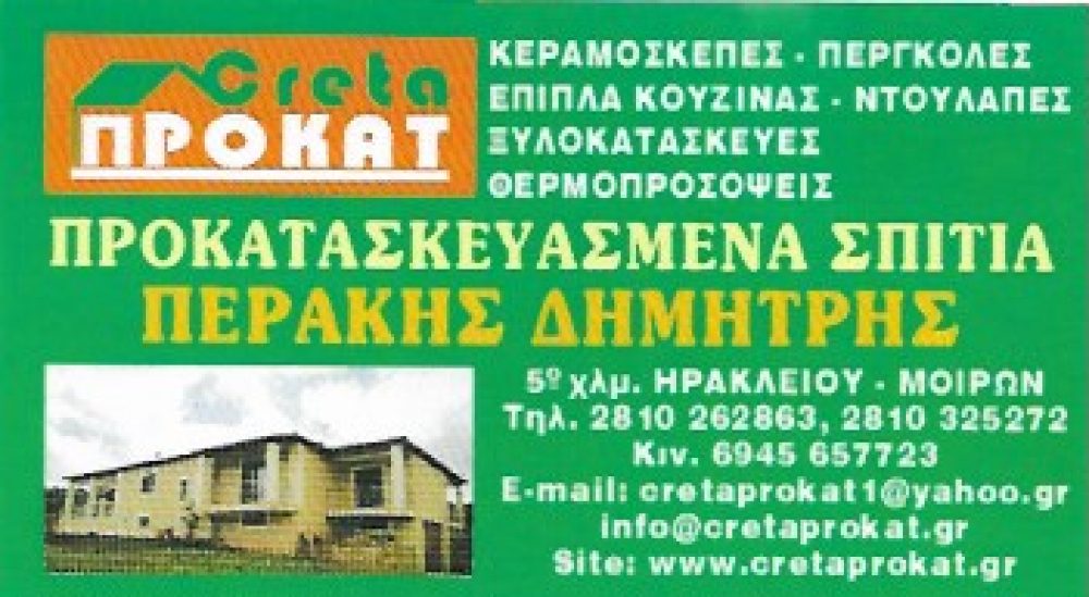 ΠΡΟΚΑΤΑΣΚΕΥΑΣΜΕΝΑ ΣΠΙΤΙΑ – ΚΤΙΡΙΑ, ΠΡΟΚΑΤ, ΠΡΟΚΑΤ ΚΑΤΟΙΚΙΕΣ, ΠΡΟΚΑΤΑΣΚΕΥΑΣΜΕΝΕΣ ΚΑΤΟΙΚΙΕΣ, ΚΑΤΟΙΚΙΕΣ ΑΠΟ ΟΠΛΙΣΜΕΝΟ ΣΚΥΡΟΔΕΜΑ, ΚΕΡΑΜΟΣΚΕΠΕΣ, ΠΕΡΓΚΟΛΕΣ, ΚΟΥΖΙΝΕΣ, ΝΤΟΥΛΑΠΕΣ, ΞΥΛΟΥΡΓΙΚΕΣ ΕΡΓΑΣΙΕΣ, ΑΝΑΚΑΙΝΙΣΕΙΣ ΚΤΙΡΙΩΝ, ΑΝΑΠΑΛΑΙΩΣΕΙΣ, ΘΕΡΜΟΠΡΟΣΟΨΕΙΣ, ΜΟΝΩΣΕΙΣ ΚΑΘΕ ΕΠΙΦΑΝΕΙΑΣ ΗΡΑΚΛΕΙΟ ΚΡΗΤΗΣ